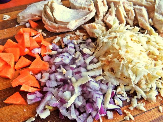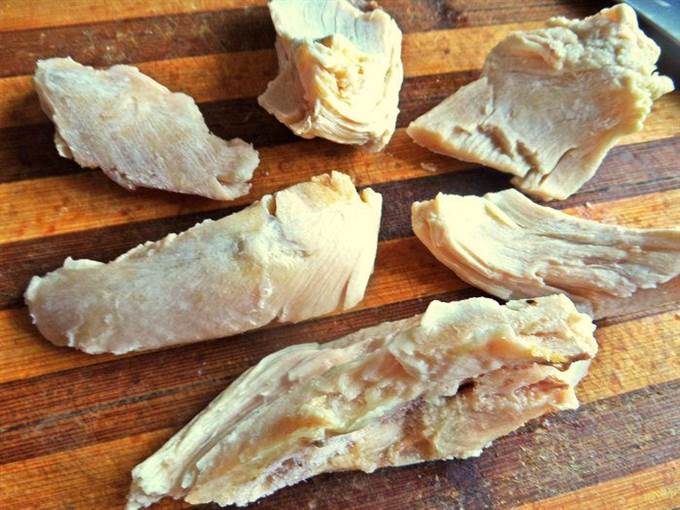 Куриное филе брала отварное. Нарезать на кусочки.
