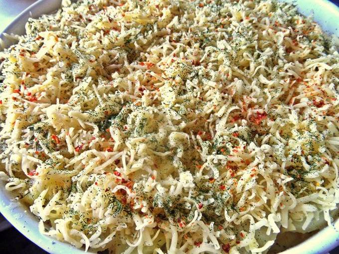 Половину выложить в смазанную форму, посолить, поперчить.