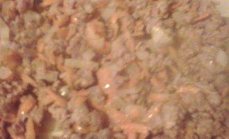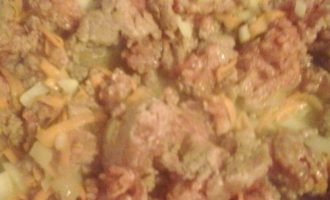 Лук нарезаем кубиком, морковь трем на крупной терке. Обжариваем на растительном масле овощи и фарш (у меня был свино-говяжий).
