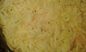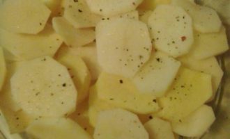 Дно стеклянной формы слегка смазываем масло. На дно формы выкладываем картофель, нарезанный кружочками, слегка солим и перчим.
