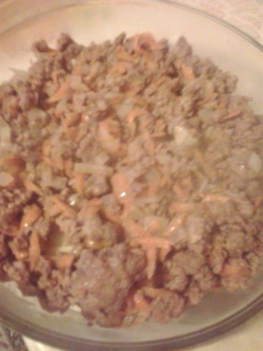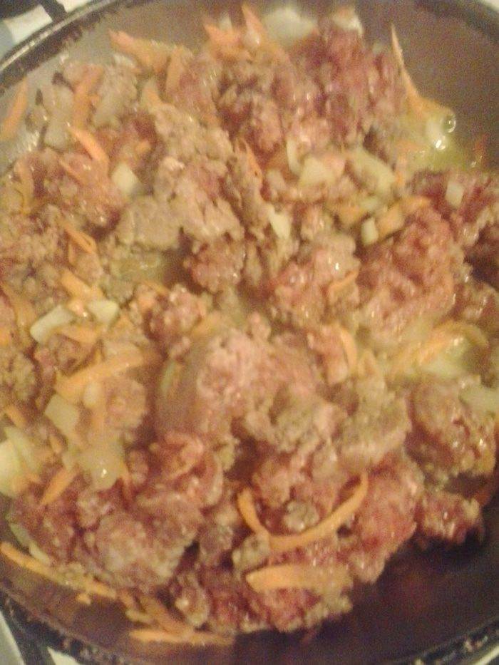 Лук нарезаем кубиком, морковь трем на крупной терке. Обжариваем на растительном масле овощи и фарш (у меня был свино-говяжий).