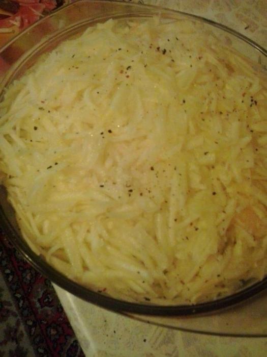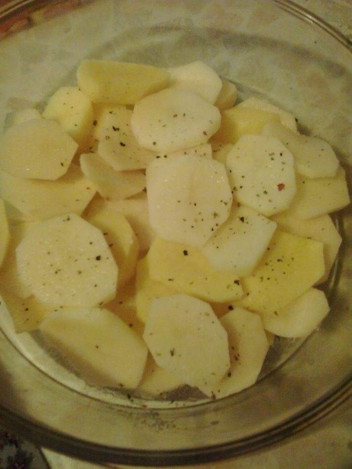 Дно стеклянной формы слегка смазываем масло. На дно формы выкладываем картофель, нарезанный кружочками, слегка солим и перчим.