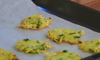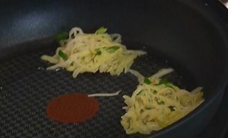 Разогреть в сковороде оливковое масло и ложкой выкладывать картофельную массу в форме тонких оладий. Слегка обжарить с двух сторон (не до румяной корочки!).