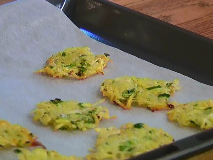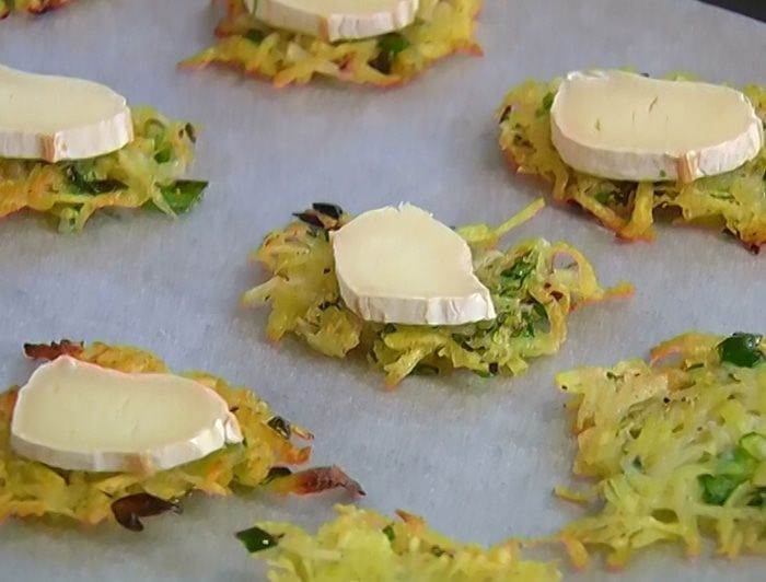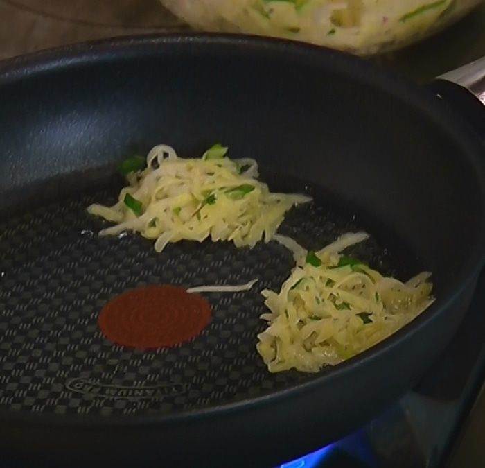 Разогреть в сковороде оливковое масло и ложкой выкладывать картофельную массу в форме тонких оладий. Слегка обжарить с двух сторон (не до румяной корочки!).