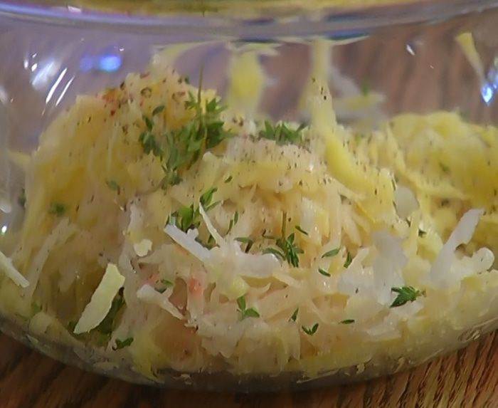 Картофель почистить и замочить в холодной воде часа на три, затем натереть на крупной терке. Натертый картофель отжать, чтобы удалить излишки жидкости.