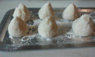 Берем немного теста, в руках расплющиваем в лепешечку, кладем начинку, защипываем и придаем форму трюфеля.
