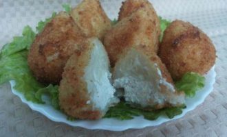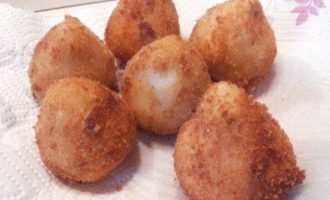 Крокеты обмакнуть во взбитое яйцо, обвалять в сухарях и обжарить во фритюре до золотистой корочки. Выложить крокеты на салфетку.