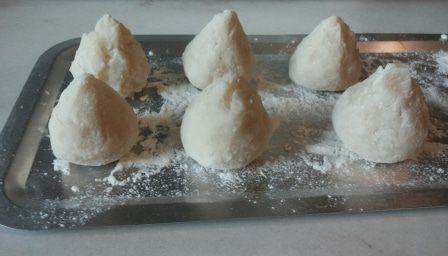 Берем немного теста, в руках расплющиваем в лепешечку, кладем начинку, защипываем и придаем форму трюфеля.