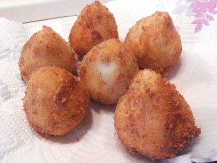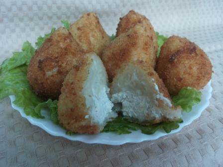 Крокеты обмакнуть во взбитое яйцо, обвалять в сухарях и обжарить во фритюре до золотистой корочки. Выложить крокеты на салфетку.
