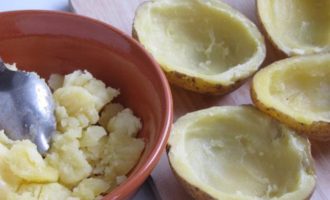 Разрезать пополам, выбрать чайной ложкой середину, оставляя бортики около 5 мм.