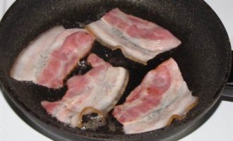 Полоски бекона разрезать на 3 части и обжарить на сковороде с двух сторон.