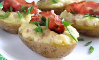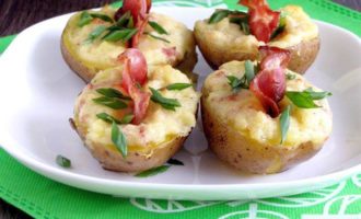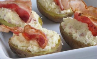 Начинить половинки картофеля, сверху украсить полосками бекона и отправить в духовку примерно на 10 минут.