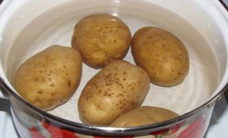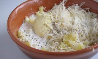 Картошку размять вилкой, добавить размягченное сливочное масло, сливки, натертый пармезан. Посолить и поперчить по вкусу. Перемешать. Сливок может понадобиться чуть больше или меньше, должна получиться консистенция густого пюре.