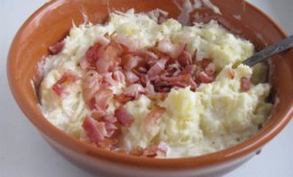 Половину обжаренного бекона нарезать кубиками и добавить в пюре.