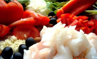 Помидоры очистить от кожи и семян, перец очистить от семян, филе-от кожи (если есть) нарезать брусочками. Лук и чеснок измельчить. На оливковом масле обжарить лук и чеснок, добавить резаный шпинат, затем перец. Немного потушить. Добавить помидоры, маслины, соль, перец и убрать с огня.