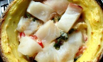 Рыбную начинку выкладывать слоями (соус-рыба-соус-рыба-соус). Также убрать в духовой шкаф на 30 мин. Готовое блюдо посыпать рублеными орехами и каперсами, украсить укропом.