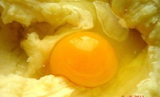 • Картофель отварить, слить воду и истолочь в пюре. Добавить масло, 1 яйцо и 1 белок. Быстро смешать, чтобы не сварился белок. Выложить пюре в жаропрочную форму и распределить по дну и бокам. Смазать бока желтком. Запекать в духовом шкафу при t 200*20-25 мин. Если у вас нет формы, которую можно поставить на стол, воспользуйтесь разъёмной, выстеленной бумагой для выпечки.