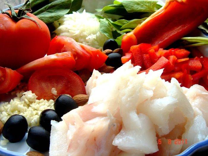 Помидоры очистить от кожи и семян, перец очистить от семян, филе-от кожи (если есть) нарезать брусочками. Лук и чеснок измельчить. На оливковом масле обжарить лук и чеснок, добавить резаный шпинат, затем перец. Немного потушить. Добавить помидоры, маслины, соль, перец и убрать с огня.
