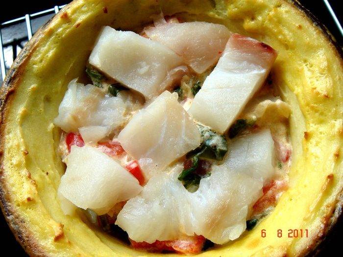 Рыбную начинку выкладывать слоями (соус-рыба-соус-рыба-соус). Также убрать в духовой шкаф на 30 мин. Готовое блюдо посыпать рублеными орехами и каперсами, украсить укропом.