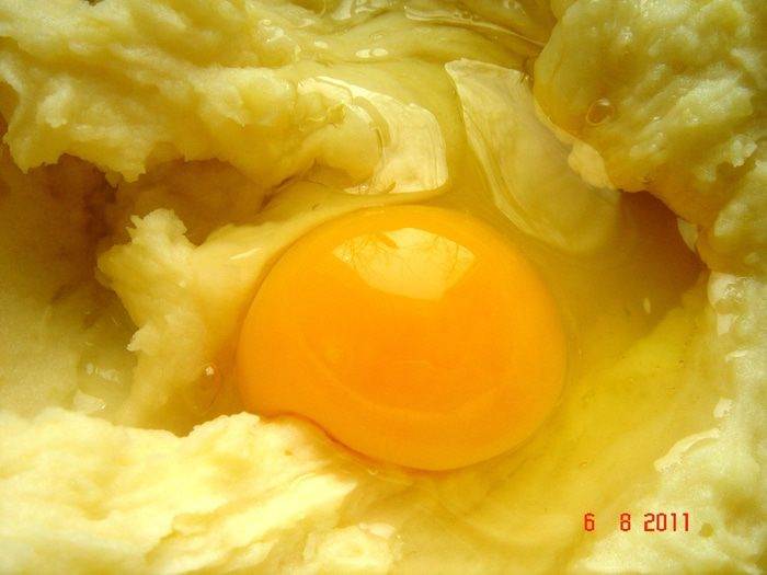 • Картофель отварить, слить воду и истолочь в пюре. Добавить масло, 1 яйцо и 1 белок. Быстро смешать, чтобы не сварился белок. Выложить пюре в жаропрочную форму и распределить по дну и бокам. Смазать бока желтком. Запекать в духовом шкафу при t 200*20-25 мин. Если у вас нет формы, которую можно поставить на стол, воспользуйтесь разъёмной, выстеленной бумагой для выпечки.