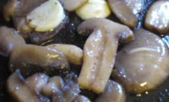 Грибы нарезать пластинками. Можно взять шампиньоны + белые грибы. В сковороде разогреть оливковое масло с зубчиком чеснока, добавить грибы, посолить, поперчить, накрыть крышкой и готовить 10 -15 минут. Чеснок удалить.