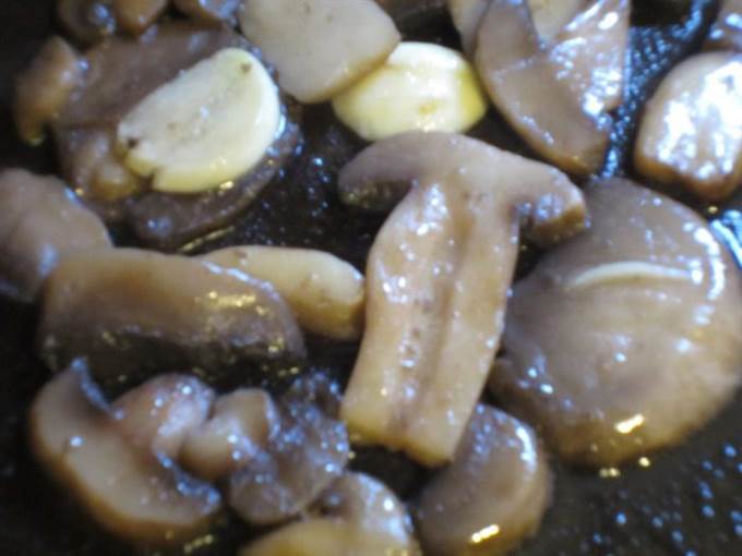 Грибы нарезать пластинками. Можно взять шампиньоны + белые грибы. В сковороде разогреть оливковое масло с зубчиком чеснока, добавить грибы, посолить, поперчить, накрыть крышкой и готовить 10 -15 минут. Чеснок удалить.