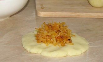 • Каждый колобок расплющить и положить внутрь начинку. Собрать края теста к центру и слепить аккуратный круглый пирожок.
