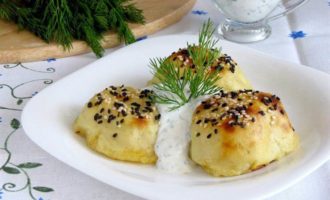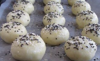 • Смазать пирожки слегка взбитым яйцом и посыпать двумя видами кунжута — черным и белым. Выпекать при 200 град. 20 минут до золотистого цвета. В конце выпечки можно включить гриль на 5 минут.