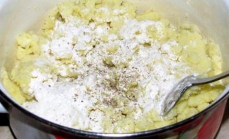 • Картофель остудить и размять, чтобы не было комочков. Жидкость не добавлять. Посолить и поперчить, добавить муку и хорошо перемешать. Получается плотное картофельное тесто, не содержащее никаких добавок.