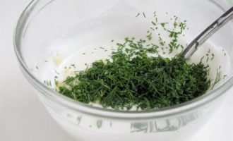 • Пока зразы запекаются приготовим соус. Смешать сметану и йогурт. Выдавить через чеснокодавилку чеснок, добавить мелко нарезанный укроп. Все хорошо перемешать.