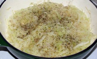 • Добавить капусту и жарить, помешивая, до мягкости капусты. Добавить сахар, посолить и поперчить. По желанию добавить прованские травы.