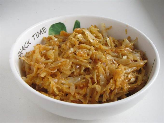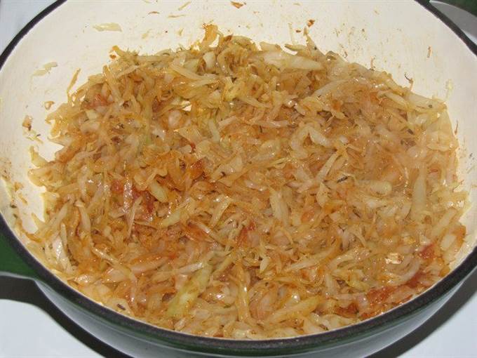 • Добавить капусту и жарить, помешивая, до мягкости капусты. Добавить сахар, посолить и поперчить. По желанию добавить прованские травы.