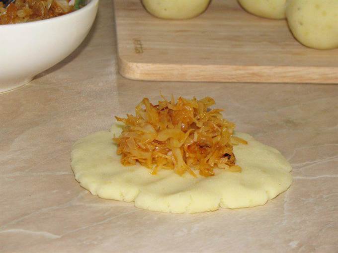 • Каждый колобок расплющить и положить внутрь начинку. Собрать края теста к центру и слепить аккуратный круглый пирожок.