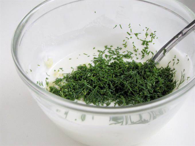 • Пока зразы запекаются приготовим соус. Смешать сметану и йогурт. Выдавить через чеснокодавилку чеснок, добавить мелко нарезанный укроп. Все хорошо перемешать.