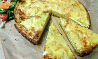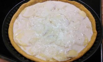 В заготовку из теста выложить половину картофеля нахлест, залить половиной яично-сливочной смеси. Позаботиться о том, чтобы не оставалось свободных полостей.