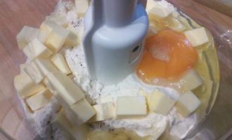 В блендере соединить муку, соль, свежемолотый перец, холодное масло, порезанное мелким кубиком и яйцо. Замесить тесто.