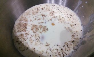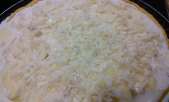 Теперь нам понадобится дуршлаг. Через него нужно слить сливки в миску, посолить и поперчить их, а также добавить щепотку мускатного ореха. Вбить яйца, разболтать и добавить половину натертого сыра.