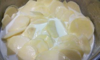 В это время займётся начинкой. Картофель очистить и тонко порезать кружочком. Удобно воспользоваться блендером с прилагающийся для этого насадкой. Кастрюлю со сливками поставить на огонь. Как только сливки закипят, снять с огня и выложить в них картофель. Накрыть крышкой и оставить в кастрюле с горячими сливками на 15-25 минут. Сыр натереть на крупной тёрке.