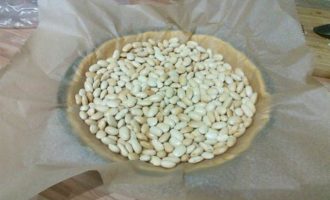 Разогреть духовку до 180°С. На тесто выложить лист пергаментной бумаги и разложить груз (фасоль или горох), слегка придавить и выпекать 20 минут. Затем достать из духовки и чуть охладить.
