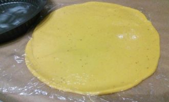 Тесто вынуть из холодильника за 15 минут до начала работы с ним для аклиматизации. На посыпанной мукой поверхности раскатать тесто круглой формы и выложить в форму для тарта (26 см в диаметре), образуя бортики. Я раскатала круг прямо на пекарской бумаге и переложила его в форму бумагой кверху. Ещё я раскатываю тесто под плёнкой, так моя скалка остаётся чистой.
