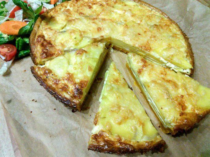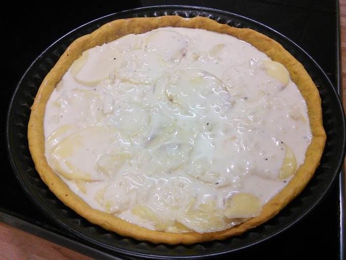 В заготовку из теста выложить половину картофеля нахлест, залить половиной яично-сливочной смеси. Позаботиться о том, чтобы не оставалось свободных полостей.