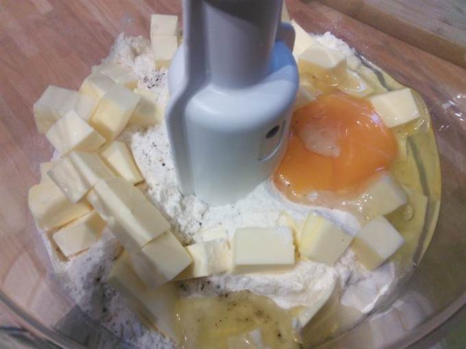 В блендере соединить муку, соль, свежемолотый перец, холодное масло, порезанное мелким кубиком и яйцо. Замесить тесто.