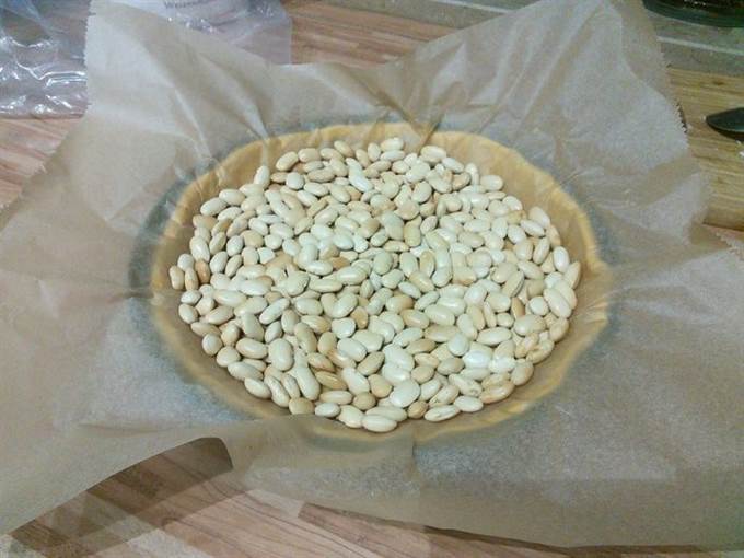 Разогреть духовку до 180°С. На тесто выложить лист пергаментной бумаги и разложить груз (фасоль или горох), слегка придавить и выпекать 20 минут. Затем достать из духовки и чуть охладить.