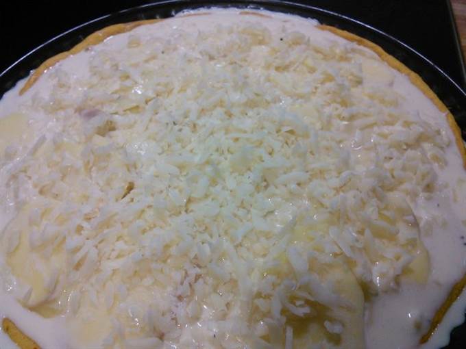 В это время займётся начинкой. Картофель очистить и тонко порезать кружочком. Удобно воспользоваться блендером с прилагающийся для этого насадкой. Кастрюлю со сливками поставить на огонь. Как только сливки закипят, снять с огня и выложить в них картофель. Накрыть крышкой и оставить в кастрюле с горячими сливками на 15-25 минут. Сыр натереть на крупной тёрке.