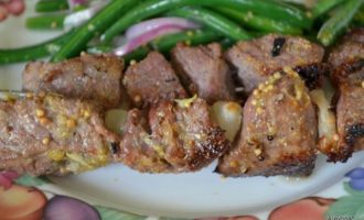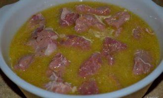 Говядину кубиками сложить в емкость и залить маринадом. Закрыть пленкой и поставить в холодильник на 2 часа или более.