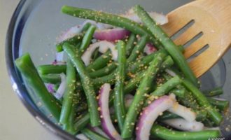 Приготовим зеленую фасоль, кончики отрежем, помоем. Лук красный нарубим.
