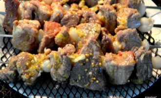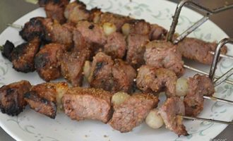 Гриль разогреем и готовим кебаб несколько минут, поворачиваем в процессе. Готовый кебаб снимем с огня на тарелку.