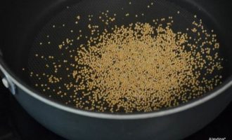 Разогреть на огне антипригарную сковороду. Выложить на нее семена горчицы. Готовить примерно 1 мин или до легкого аромата. Снять с огня и переложить в емкость, раздавить. Отложить из общей емкости в сторону 1 стол.л. горчицы. -