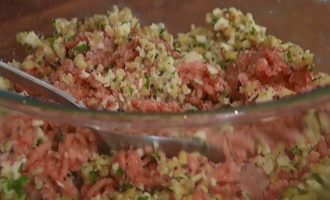 Фарш соединить с измельченной моцареллой, посолить, поперчить и перемешать.