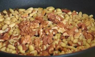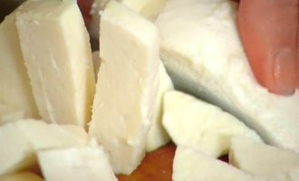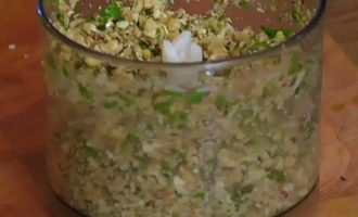 Добавить к моцарелле листья мяты, орехи и тмин, влить 1 ст. ложку оливкового масла и взбить все в блендере.